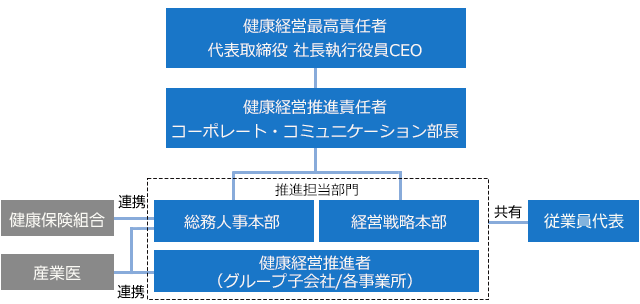 当社グループでは、代表取締役 社長執行役員CEOが健康経営の責任者となり、健康経営を推進しています。推進担当部門では、健康経営に関する課題の抽出や目標の設定、行動計画の策定などを行い、その内容については経営トップの承認を得ています。